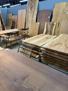 当社観音寺ショールームと塗装室には100枚を超える一枚板テーブルの完成品と、直ぐに取り掛かり可能な乾燥材500枚以上を常に在庫しております。