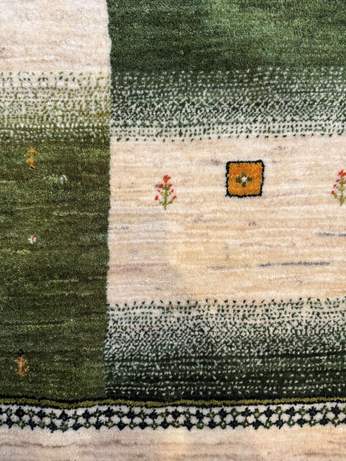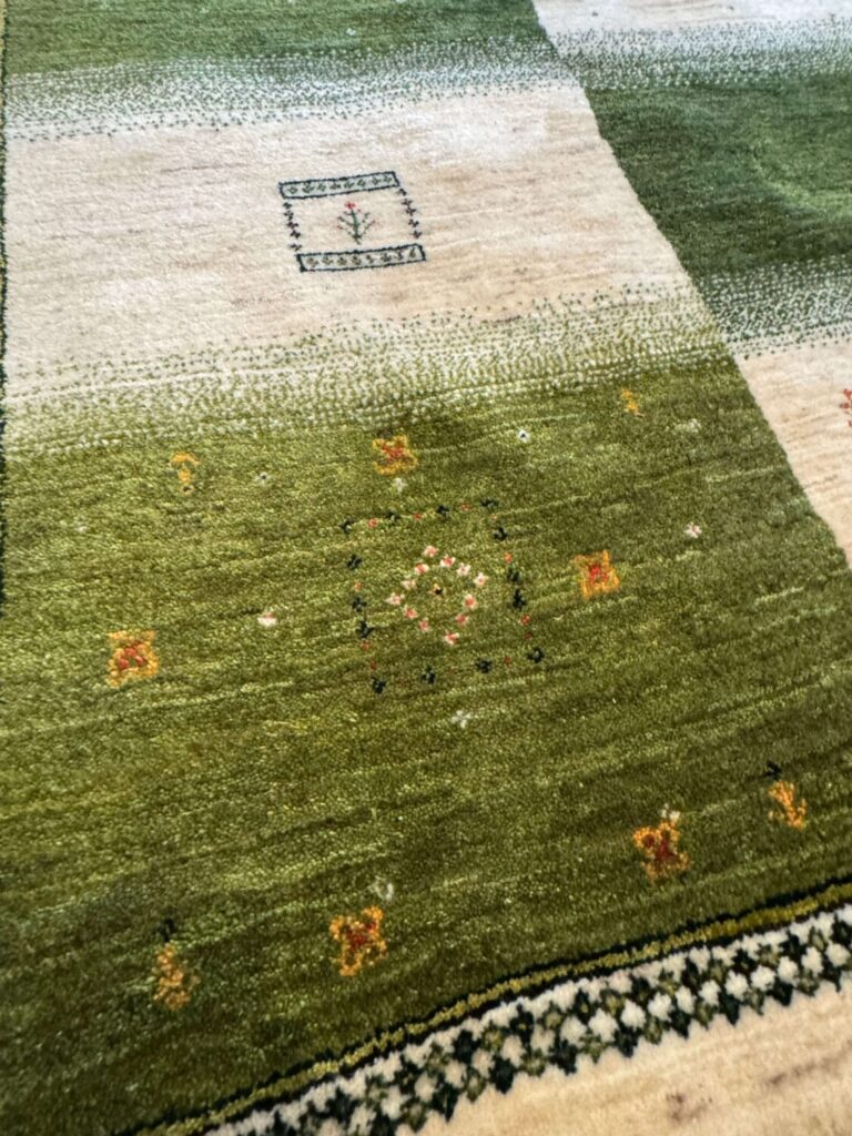 こちらのギャッベは、深みのあるグリーンと生成りを基調に、市松状に構成されたデザインが印象的な一枚。濃淡の異なるグリーンが使い分けられており単色でありながらも表情が豊かで、見る角度や光の入り方によって微妙に印象が変わります。まるで草原や大地を思わせるような、自然の広がりを感じさせる色合いです