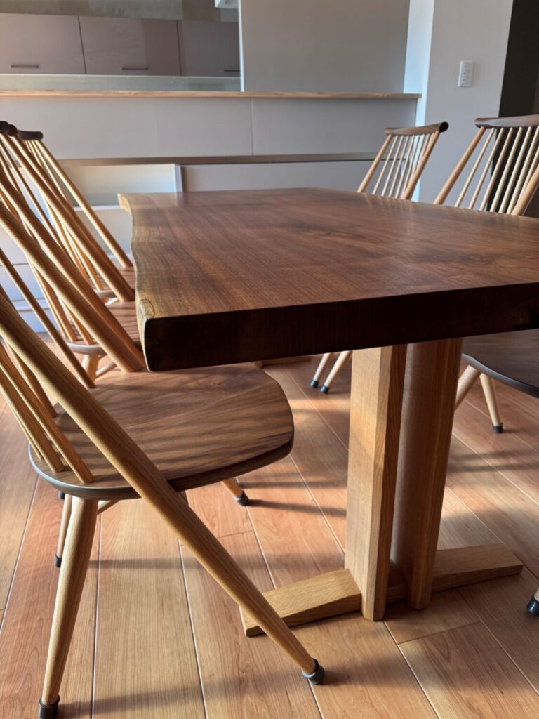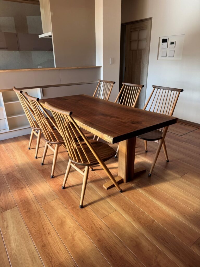 リフォームを終えたお客様の広いダイニングへ納品。ブラックチェリー材のフローリングと並ぶことでウォールナットの落ち着いた色合いがより一層引き立ち、空間全体に統一感と奥行きが生まれました。