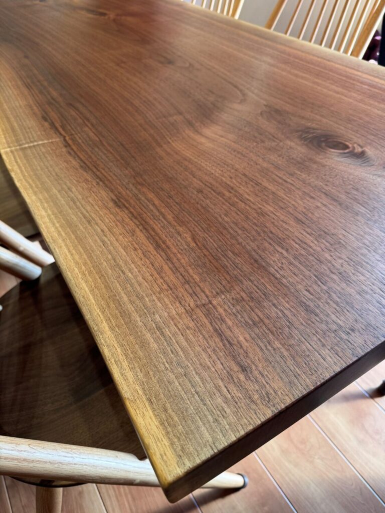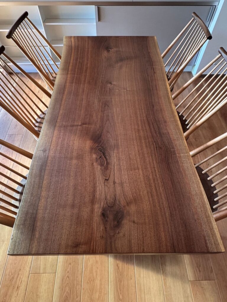 シンプルな形、杢目ですが、ウォールナットらしい深みのある芯材が独特の高級感を感じさせる一枚。渾身の一枚をお選びいただき、テーブルに仕上げてお届けさせていただきました。