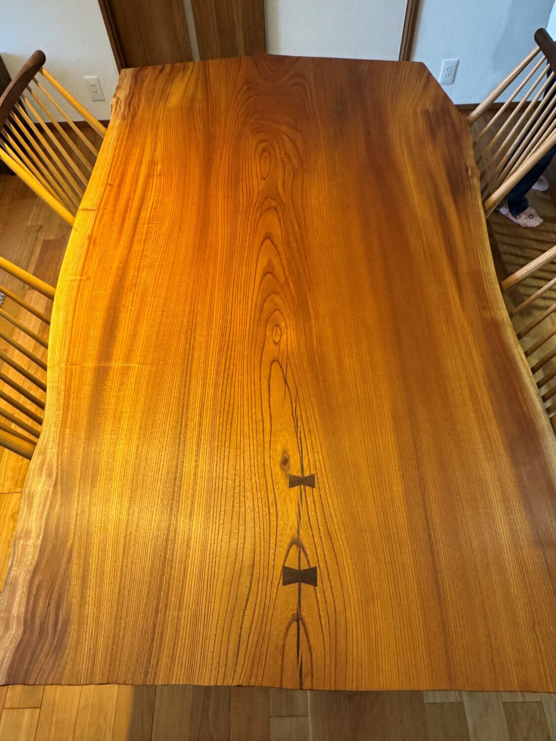 流れるような年輪と、ところどころに現れる濃淡の揺らぎは、長い年月をかけて育った欅ならではの表情です。中央には木の個性を活かす形で契木(ちぎり)を施し、意匠性と強度の両立を図りました。