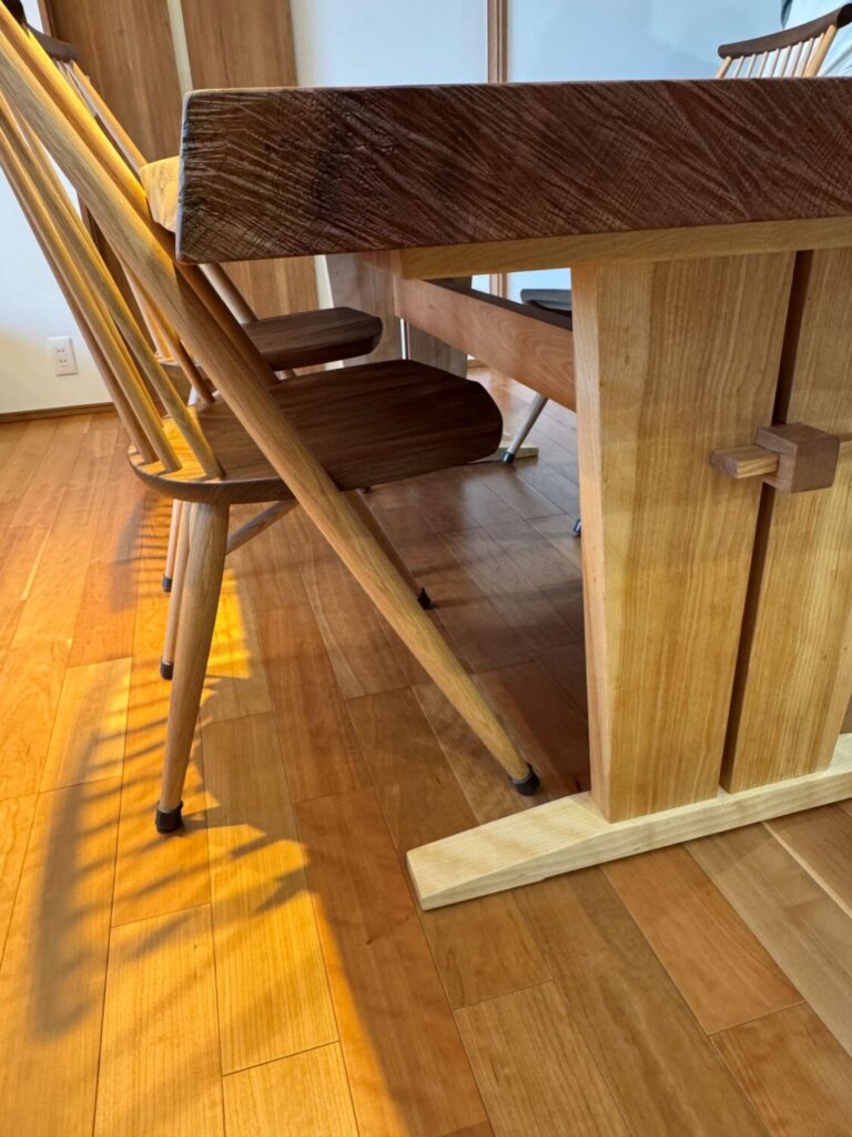 天板は木の動きを見極めながら丁寧に仕上げ、耳付きのラインも過度に整えすぎることなく自然の造形をそのまま残しています。脚部とのバランスや高さも空間に合わせて設計し、日常使いの中で自然と身体に馴染む一台となるよう心掛けました。