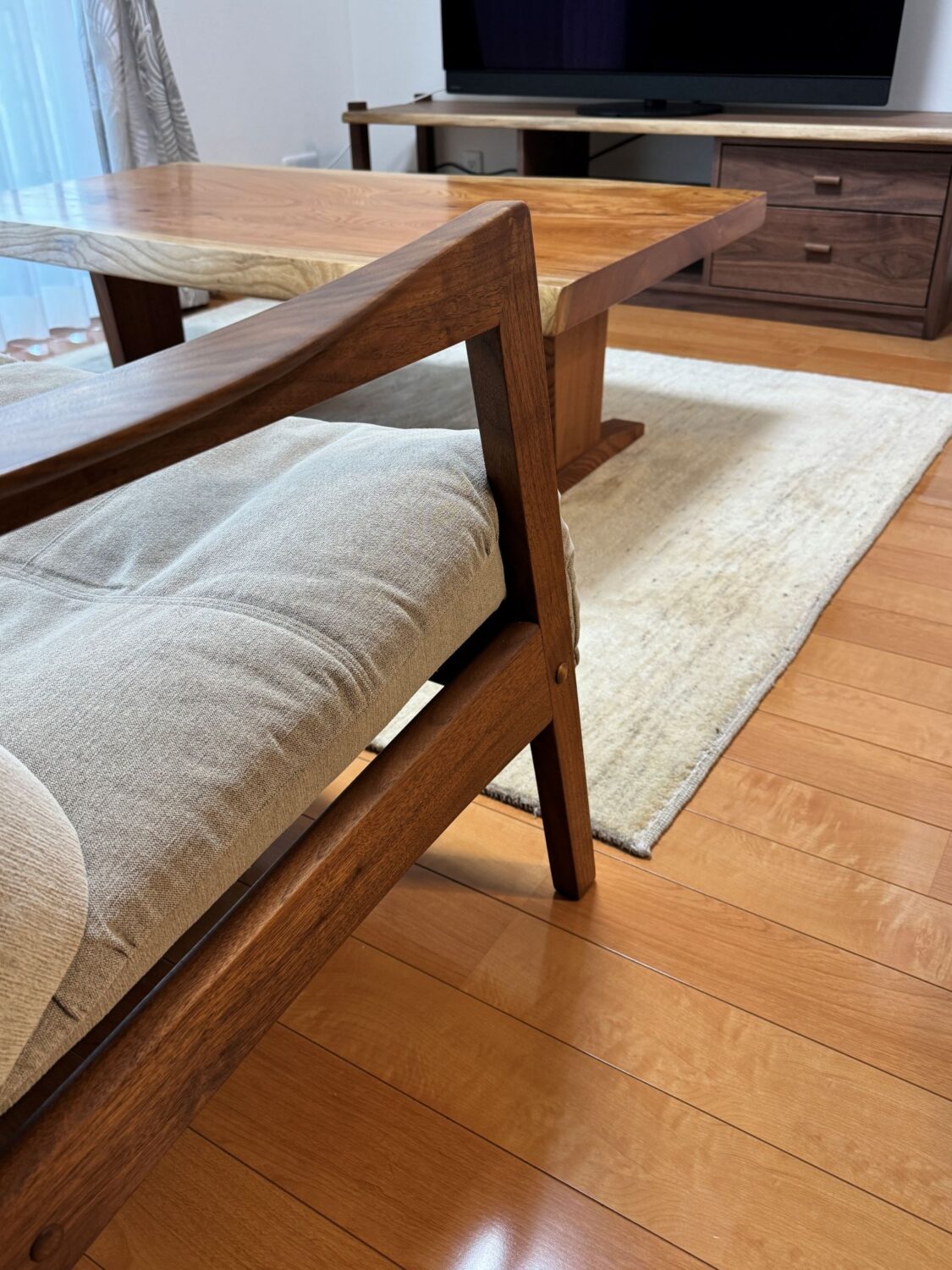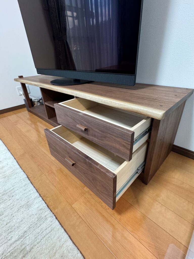 テレビボードは、直線的で無駄のないデザインの中に、引き出しや収納の使い勝手を考えて製作しています。