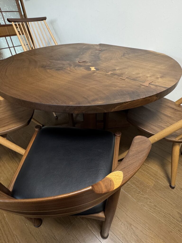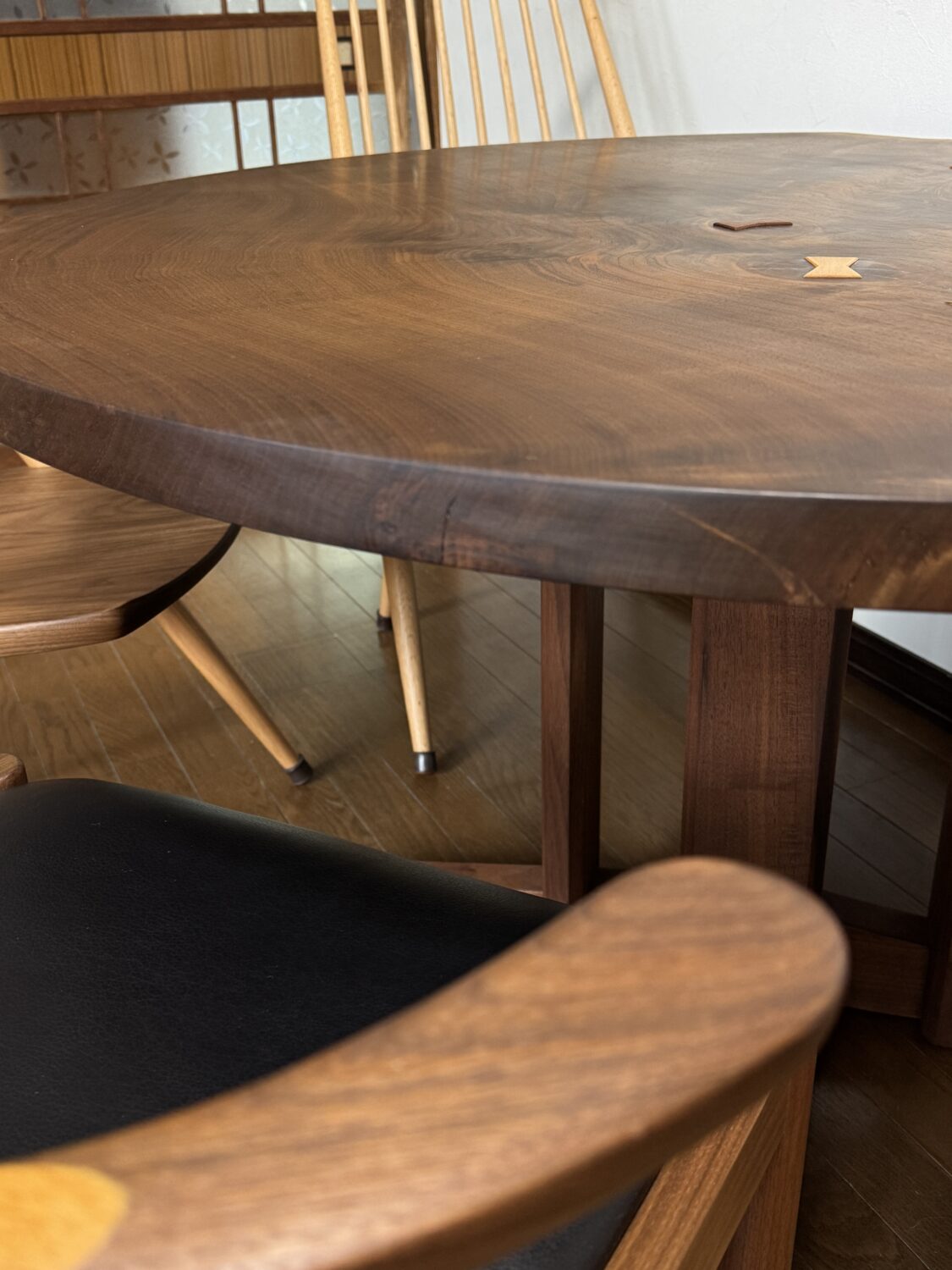 ウォールナットの中でも特に表情豊かな木目と雰囲気を持つ材を選び、大胆に丸天板へと加工。素材の個性をそのまま活かした、存在感のあるテーブルに仕上げています。
