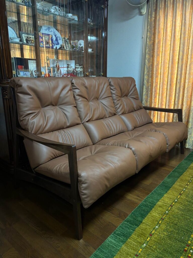 ウィンザーデザインを基調としたハイバック仕様のソファは、当店ショールームにて気に入っていただいた一台。本革仕様にて製作し、座り心地と質感ともに大変美しい仕上がりとなりました。