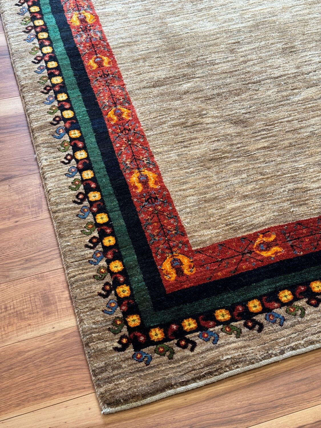 周囲には深い緑や茜色の縁取りが施され、原毛の落ち着いたフィールドを引き締めながら、空間に程よい彩りを添えています。