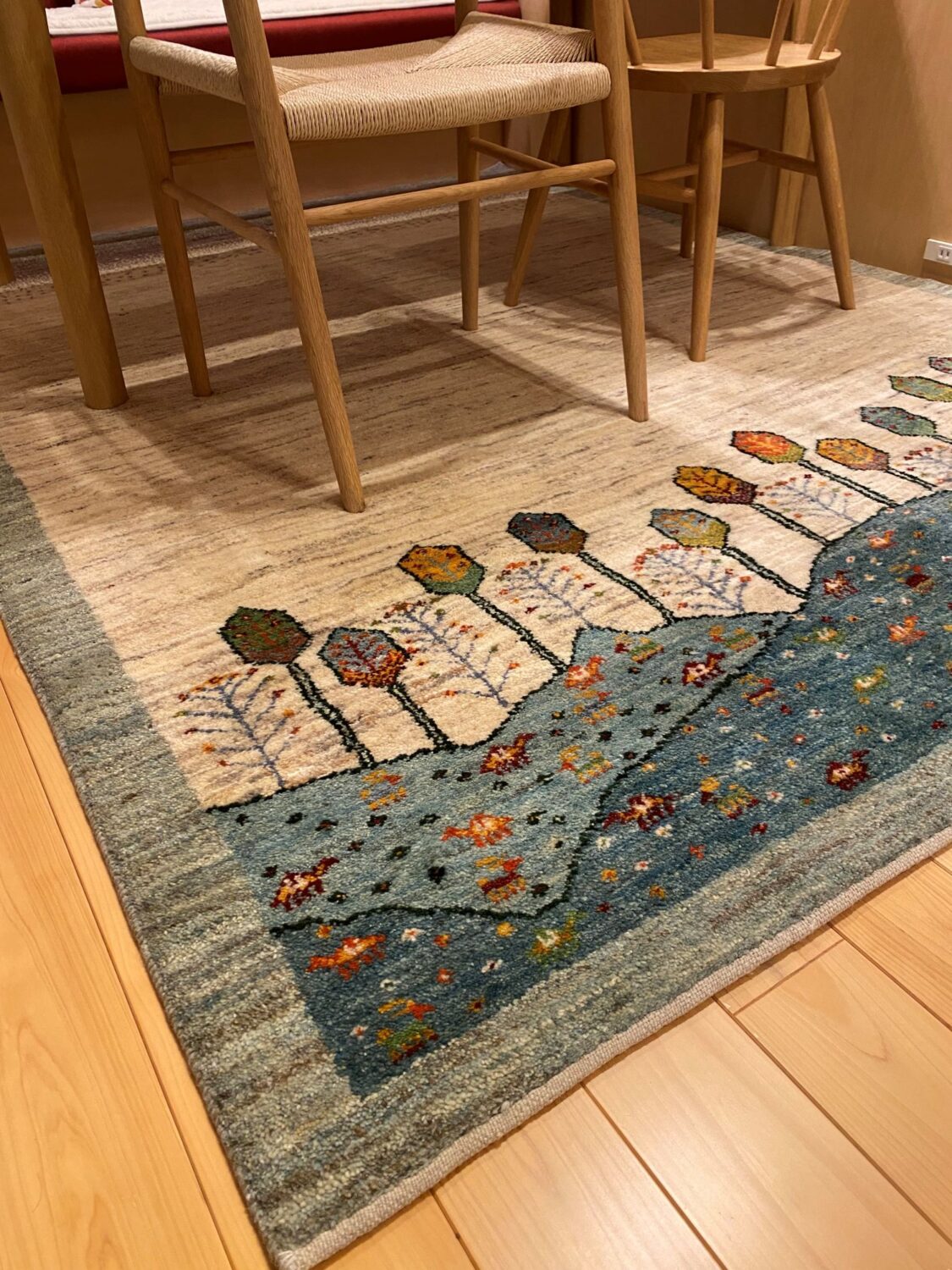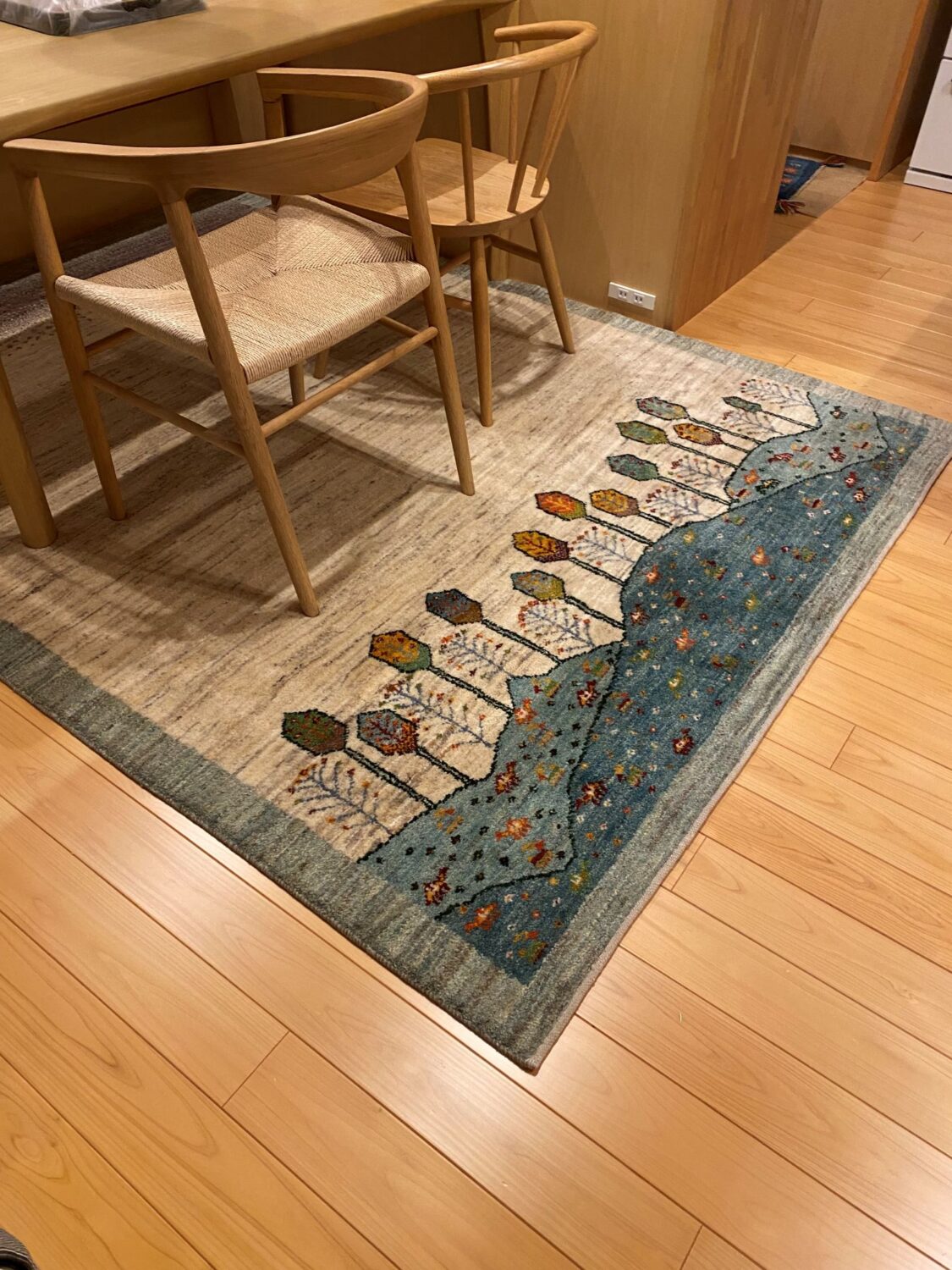 木の家具とも相性がよく、ナチュラルな空間にやさしく溶け込みながら、暮らしに彩りを添えてくれるギャッベとなりました。