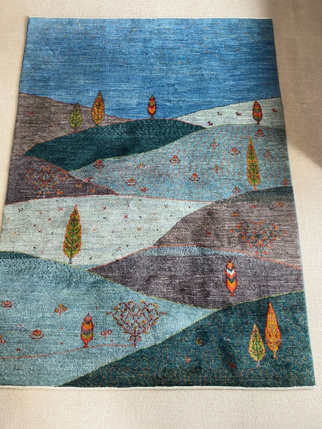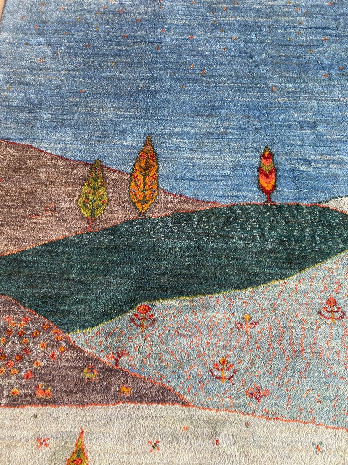 こちらのギャッベは、イラン南西部に広がるザクロス山脈の風景をそのまま絨毯の中に織り込んだような、非常に大胆で美しいデザインが特徴の一枚です。青く広がる空や、なだらかな丘陵、そこに静かに佇む木々の姿が、まるで一枚の風景画のように表現されています。ザクロスの大地を映す一枚